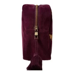 A beautiful cotton velvet wash bag featuring an intricate golden bee thread design, in a unique stylish plum-hued shade.